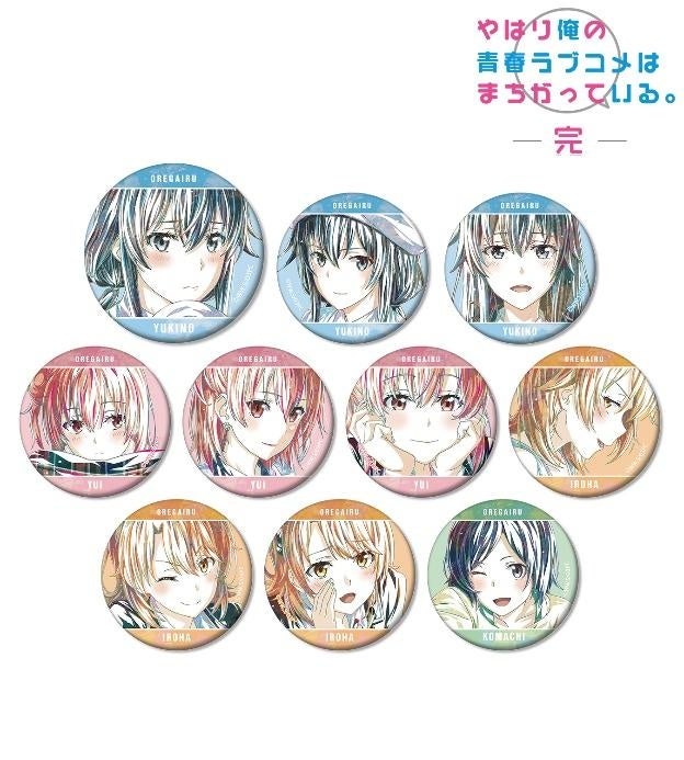 雪ノ下雪乃、由比ヶ浜結衣、一色いろは、比企谷小町を新たなタッチで魅力的に表現し、マットな手触りの缶バッジに仕上げました。