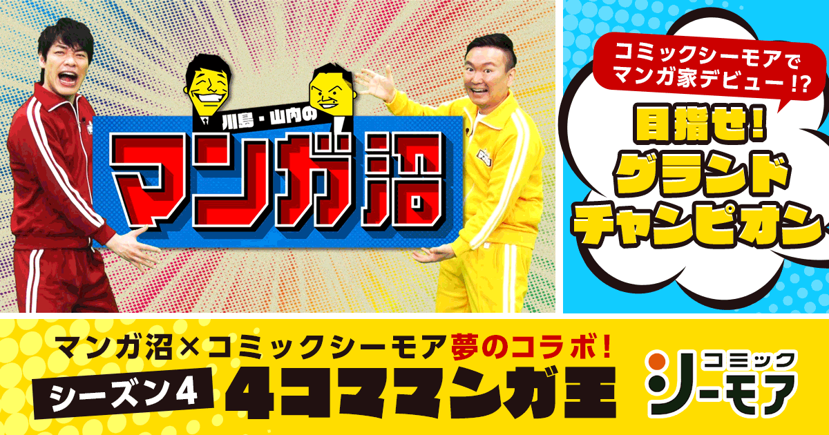 「川島・山内 マンガ沼」の人気コーナー「4コママンガ王 決定戦」シーズン4とコラボレーション。シーズン4のグランドチャンピオンは、コミックシーモアのオリジナルコミック編集部であるソルマーレ編集部から、「マンガ家」としてコミックシーモアでデビューできます。
