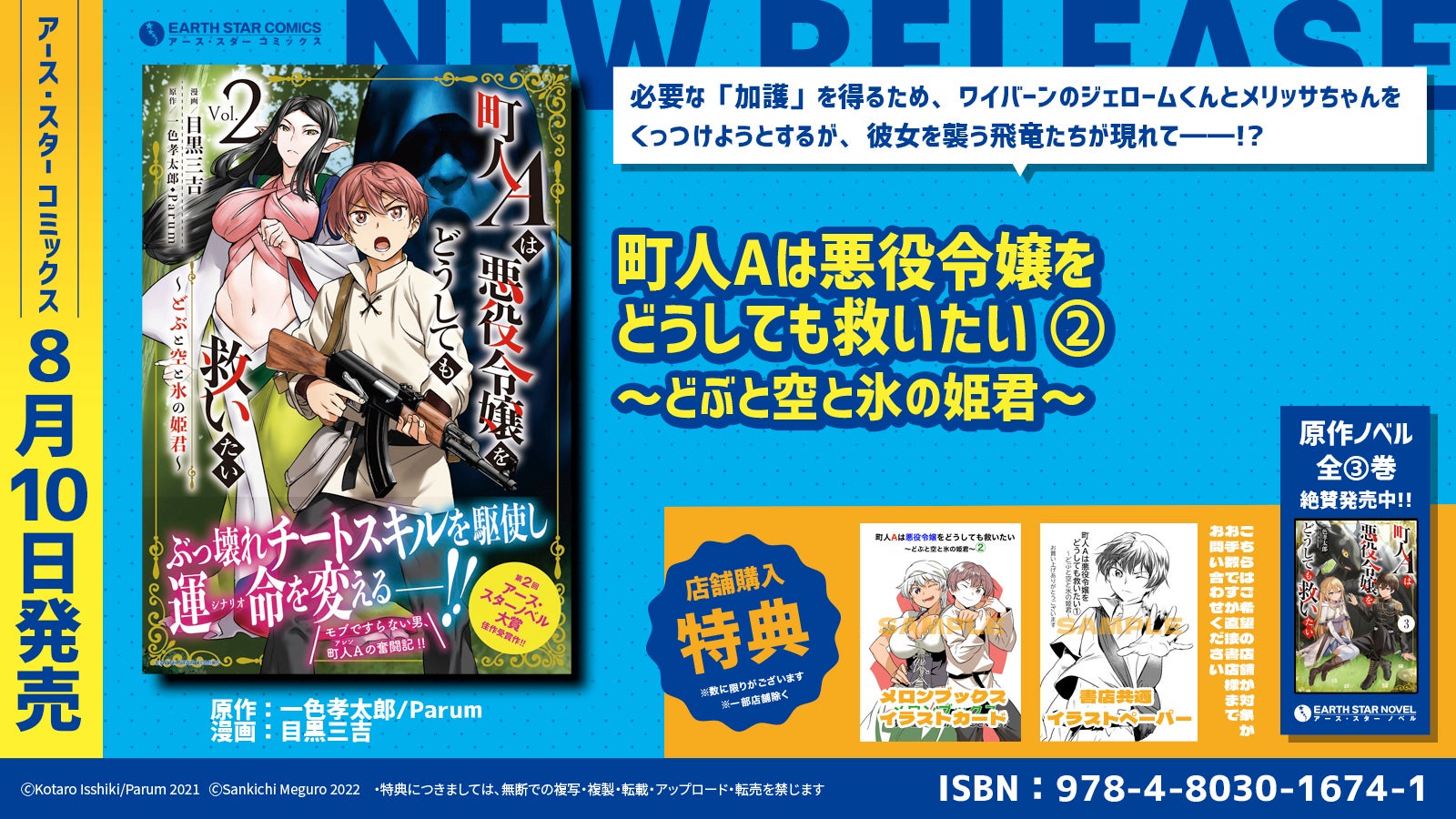 アース・スターノベルより刊行している人気ノベル作品が原作で、現在コミック アース・スターで連載中の人気作品『町人Aは悪役令嬢をどうしても救いたい ~どぶと空と氷の姫君~』コミックス第2巻を8月10日(水)に発売いたします。