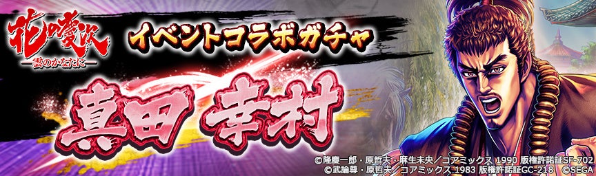 今回のコラボレーションイベントでは、『花の慶次-雲のかなたに-』のキャラクターが「北斗リバイブ」に参戦!UR「真田 幸村」は、8月5日(金)より実施される“イベントコラボガチャ:真田 幸村”に登場します。ぜひ、この機会に「真田 幸村」を迎え入れましょう。