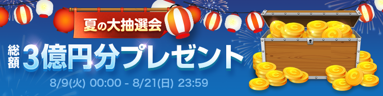 全作品を対象に作品購入後に開始される抽選で、1等に当選されると100%相当のコイン/ポイントを還元。2等は50%相当のコイン/ポイント、3等は10%相当のコイン/ポイントの還元となっております。期間は8/9(火)0:00〜8/21(日)23:59となっておりますが、期間中であっても、3億円を使い切り次第イベント終了となります。