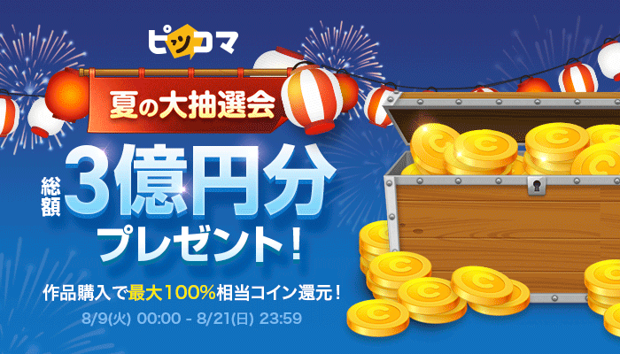 3億円分のコイン/ポイントが還元される、お得な「夏の大抽選会」をお見逃しなく、ぜひピッコマをチェックしてみてください。「ピッコマ」は「作品が主役」という理念の下、今後も皆様と作品の新たな出会いとなるようなキャンペーンやイベントを行ってまいります。