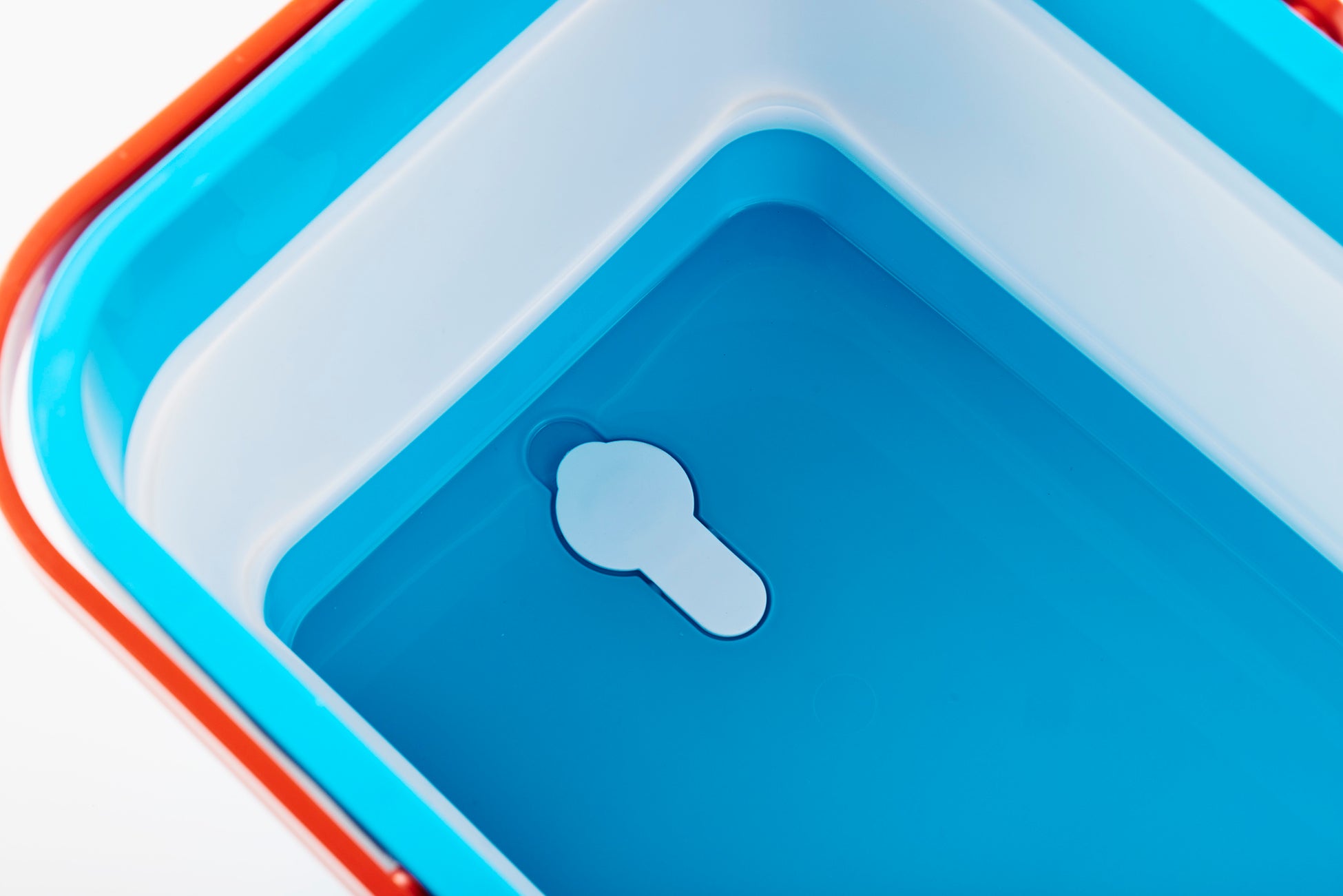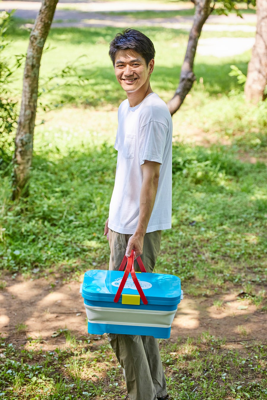 バスケットの底には、エラストマー製の水抜き栓が付いています。引き上げると穴が開いて水が抜けていくので、水を溜めて使ったときに、重いバスケットを傾けなくてOK。食器を洗ったり、夏には氷を張ってドリンクやフルーツを冷やしたりと、キャンプやピクニックでマルチに活躍します。