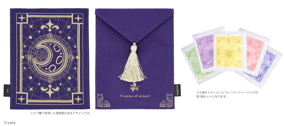 作品に登場する賢者の書のデザインをイメージし、レピア織で表現した高級感のあるポーチと各国のフレーバーティが1包ずつ入ったセット。