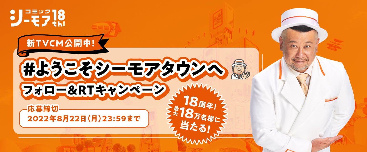 この度、コミックシーモアの18周年記念日である8月16日(火)より、最大18万名様にデジタルギフトやシーモアポイントがその場で当たる「#ようこそシーモアタウンへ フォロー&RTキャンペーン」をTwitter上で実施します。