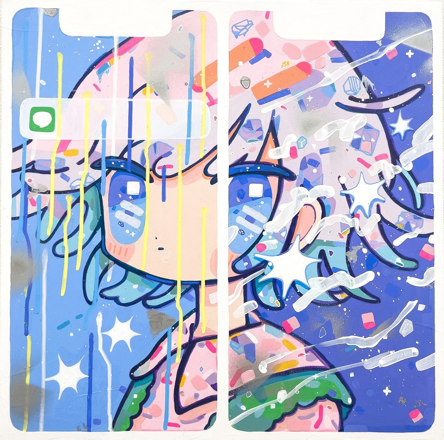 本展では、スマートフォンをモチーフにした作品をメインに展示します。2つの画面が並んで描かれている作品は、本を開いたようにもみえるかもしれません。