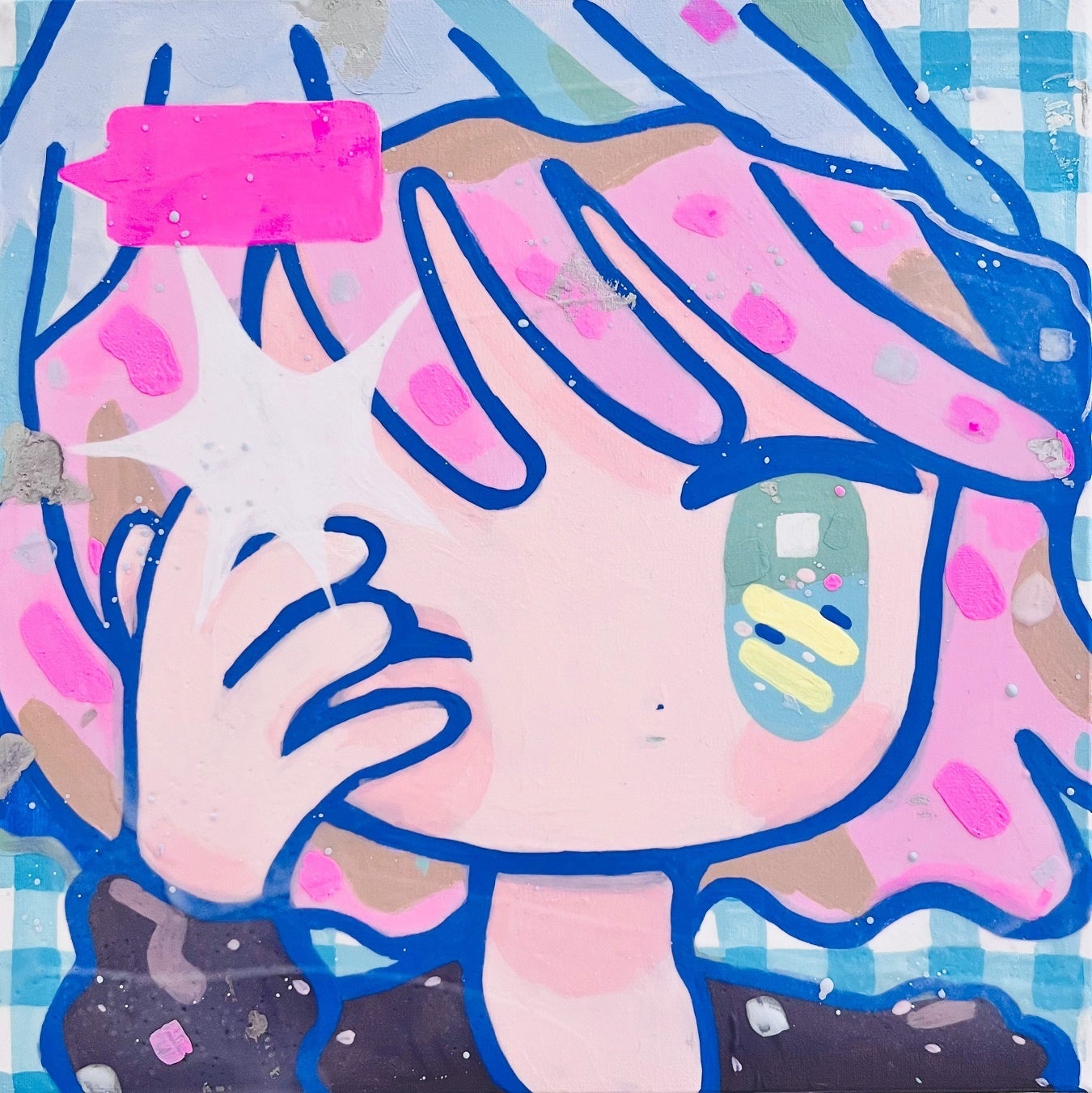幼い頃に親しんだ少女漫画のような大きな瞳や、ファンシー雑貨のような色彩など、独自のキャッチーさで鑑賞者を引き込み、描かれた人物と対話ができるような作品を目指す。