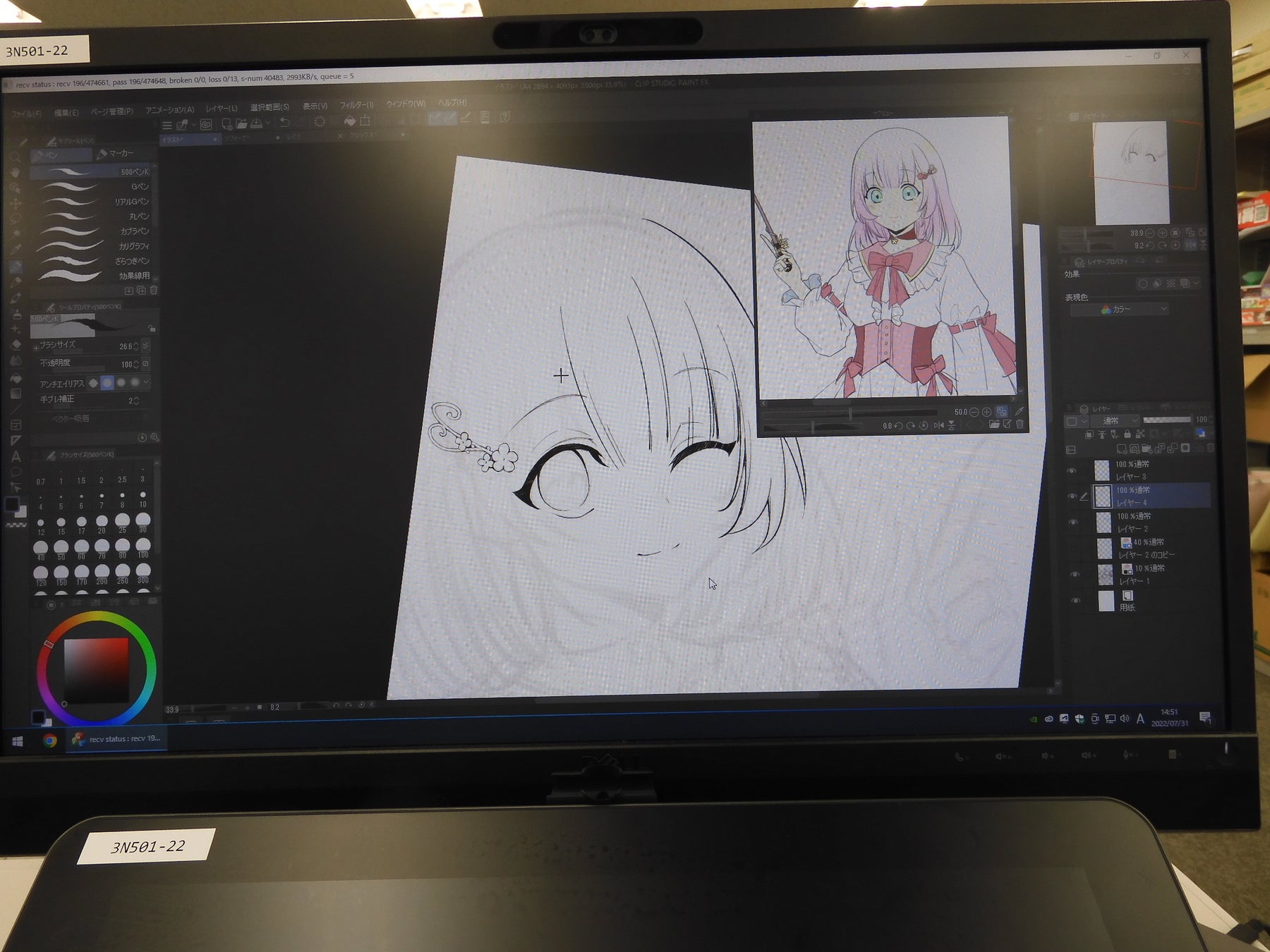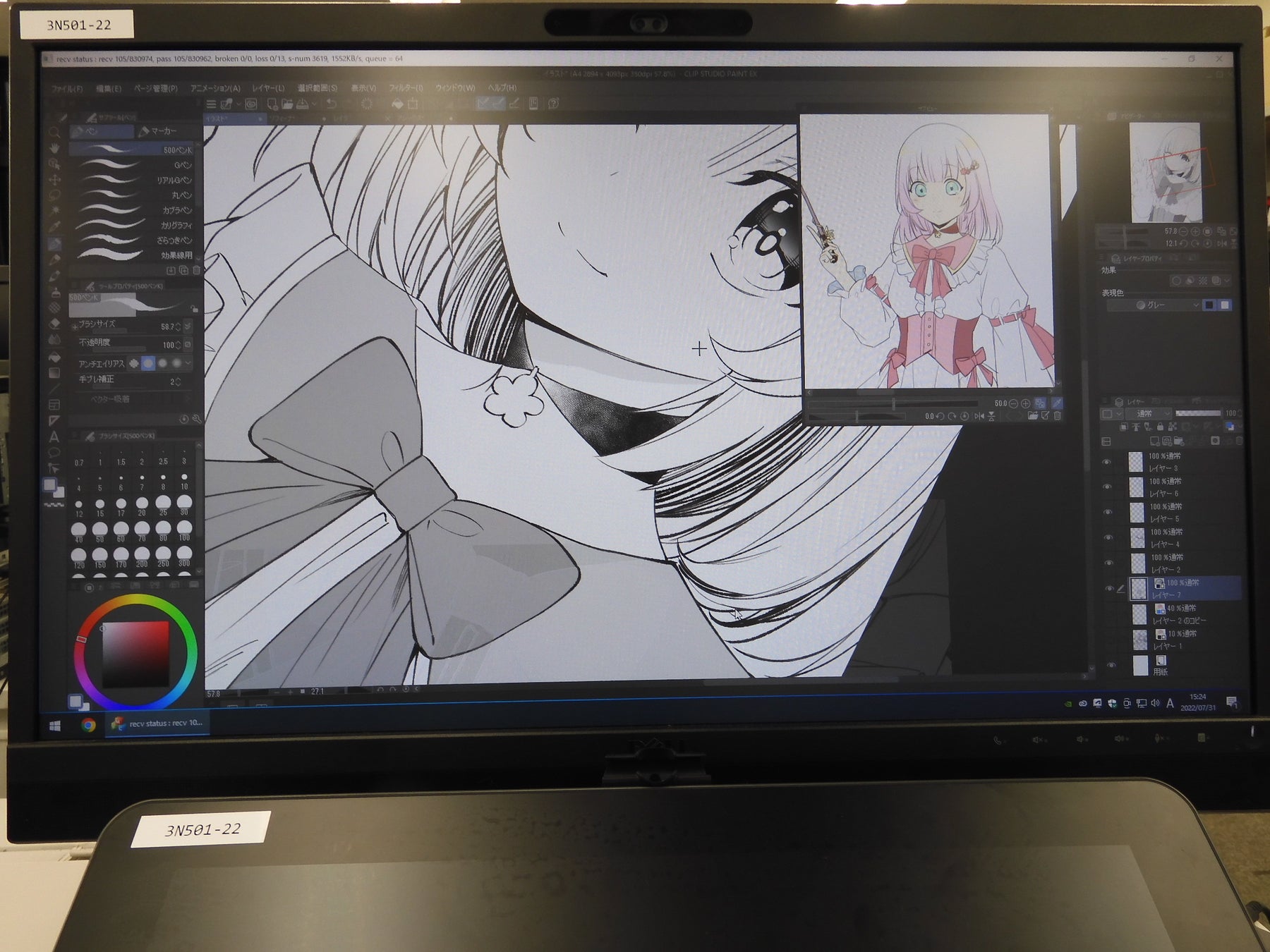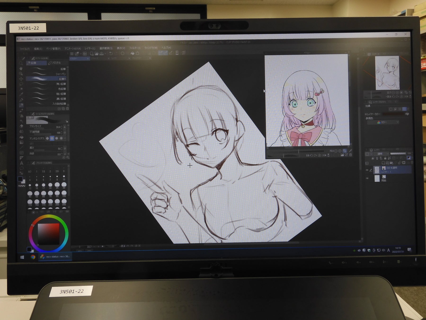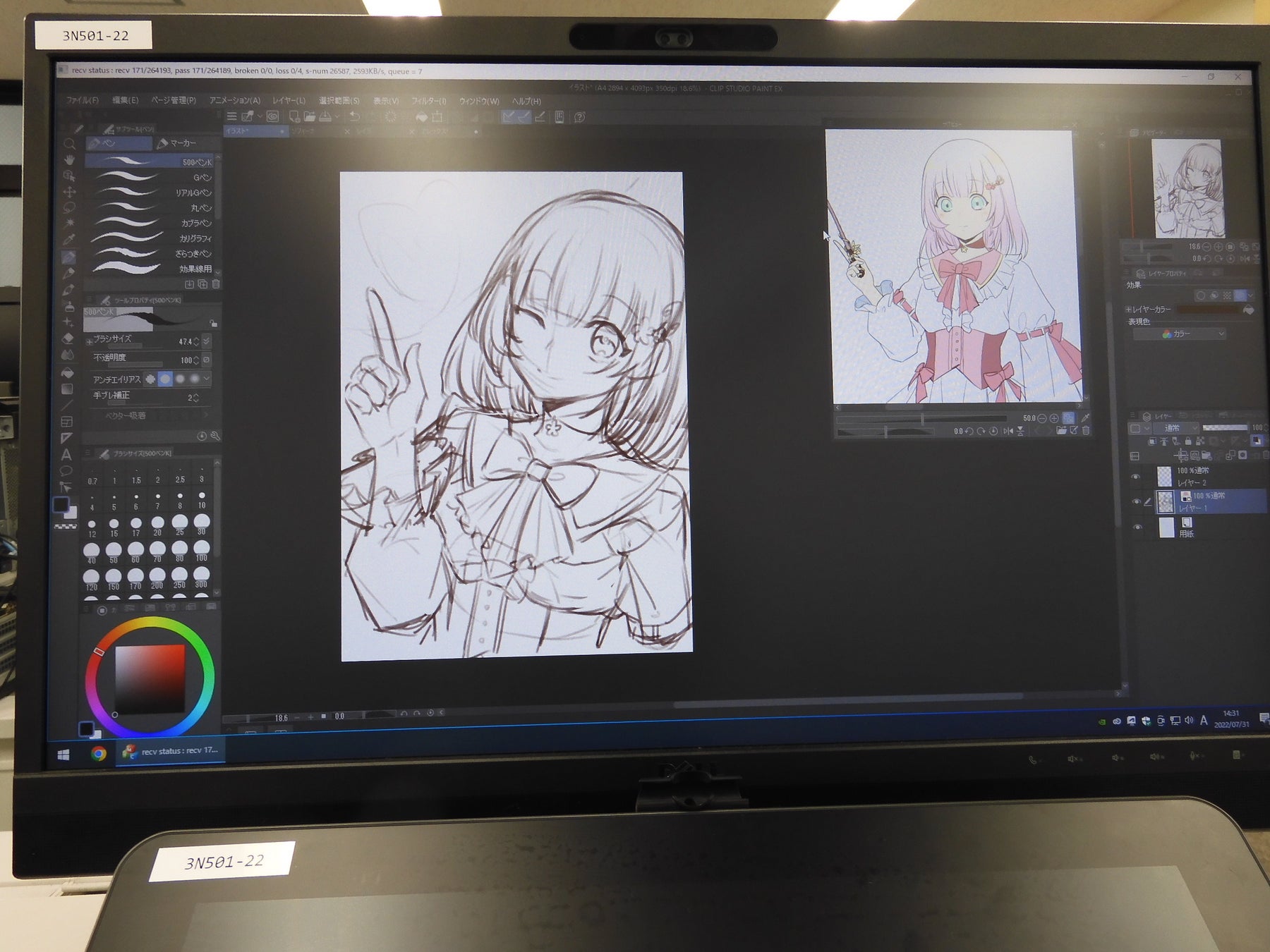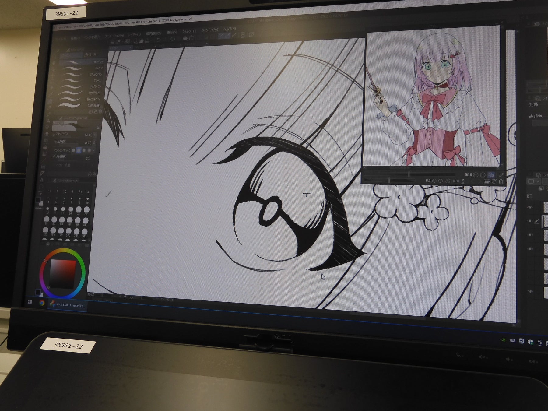 ライブペイントでは、デジタルツールであるCLIP STUDIO PAINT(クリスタ)を使って連載作品の主人公を描いてくださるとのことで、とても楽しみです。また、慣れた手つきで絵を描いていくと同時に、マンガイラスト学科担任・上野先生と対談形式で貴重なトークが繰り広げられました。