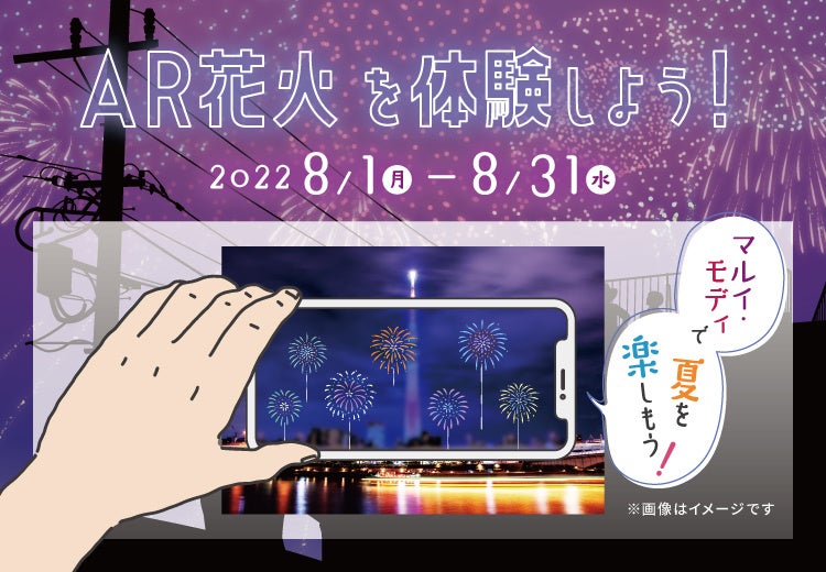 マルイ・モディに来てこの夏を楽しもう!スマホをお持ちの方ならどなたでも、店内の二次元コードを読み込んで、夜景写真のポスターにかざすだけで打ち上げ花火がご覧いただけます!エリアや店舗によって異なる花火が見られるかも?