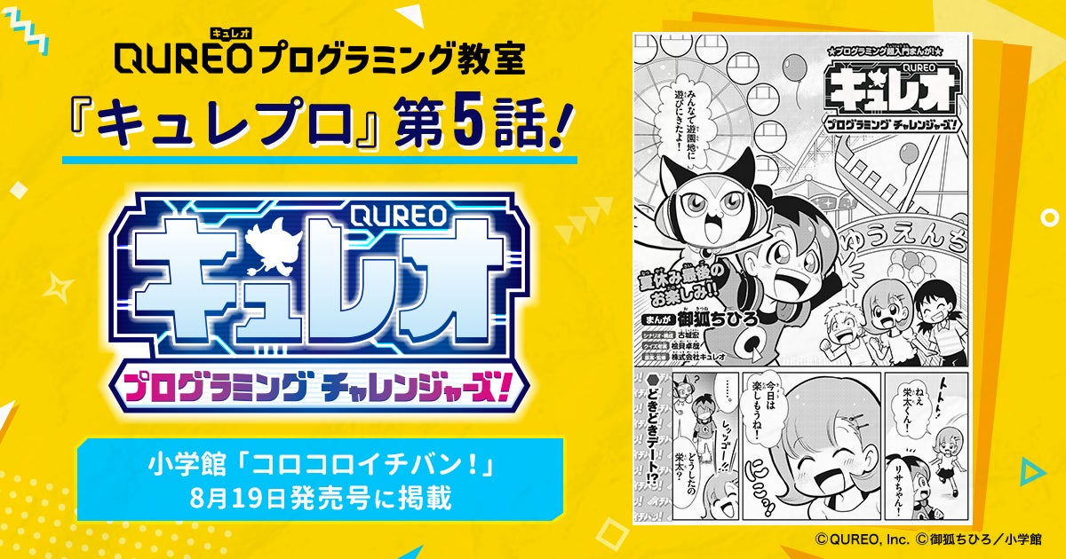 株式会社CA Tech Kidsと株式会社スプリックスとの合弁会社で、プログラミング教材の開発・運営・販売事業を行う株式会社キュレオ(本社:東京都渋谷区、代表取締役社長:上野朝大)は、運営する子ども向けプログラミング教室「QUREO(キュレオ)プログラミング教室」https://qureo.jp/ が全面監修するプログラミング学習マンガ『キュレオ プログラミングチャレンジャーズ!(通称:キュレプロ)』の最新回となる第5話の内容をお知らせいたします。第5話が掲載される、小学館「コロコロイチバン!」8月19日発売号の本誌ページの一部も公開いたします。