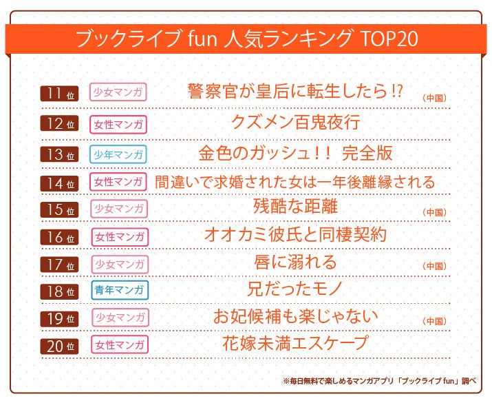 ブックライブ funは中国の縦スクロールコミックだけではなく、国内外のマンガを多く取り揃えており、たくさんのマンガを楽しめます。ブックライブ funのサービス開始から期間中集計した、話配信形式マンガの人気作品ランキング トップ20を発表します。