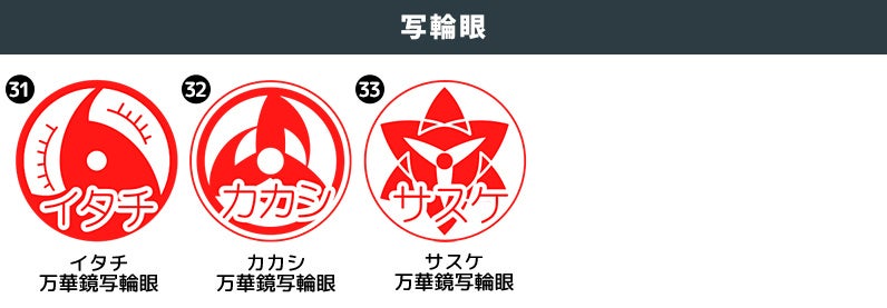ファンにはおなじみの、作品に登場する伝説の瞳術「万華鏡写輪眼」のモチーフも選ぶことができます。