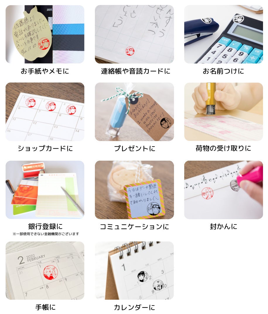 荷物の受け取りやメモなどへのサイン替わり、持ちものへのお名前つけ、お子さまの連絡帳や音読カードなどにポンポン押せるセルフインクタイプ、全国ほとんどの金融機関にも登録できる木彫りタイプ、黒水牛タイプから選べます。