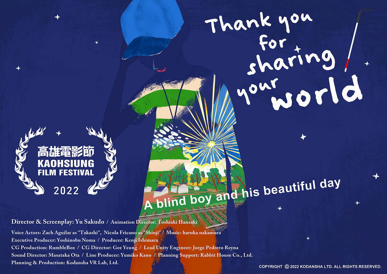 株式会社講談社VRラボ(本社:東京都中央区、代表取締役:石丸健二 以下当社)が企画・制作したVRアニメーション『Thank you for sharing your world』(以下本作)が、2022年10月14日~30日に開催される 2022 KFF Film Festival(高雄映画祭)のVR部門コンペティションにノミネートされました。イベント中、ノミネートだけでなく、本作は展示される予定です。