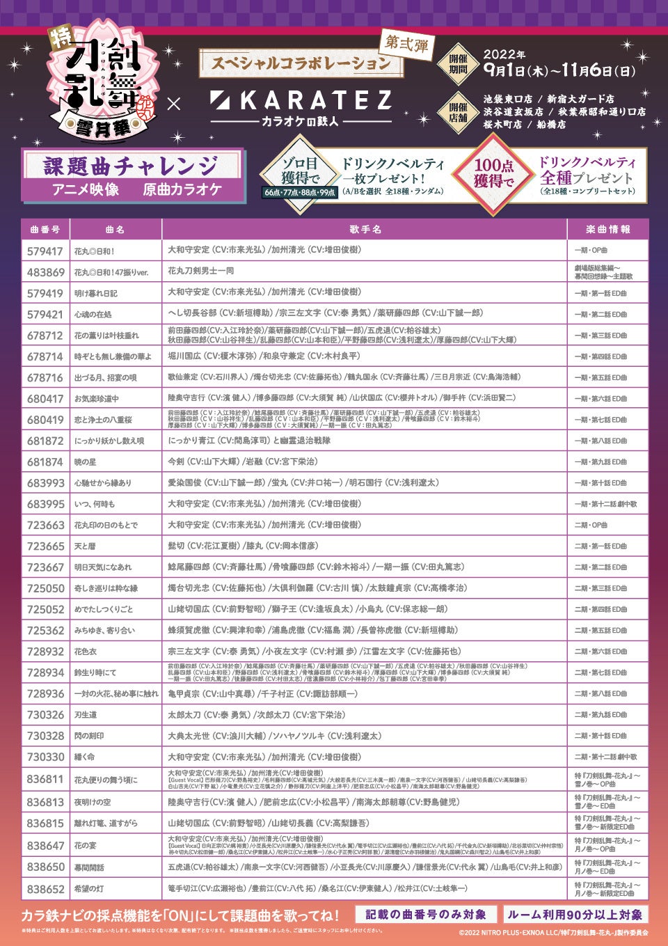 株式会社鉄人化計画(所在地:東京都目黒区、代表取締役社長:根来拓也)は、当社が運営する「カラオケの鉄人」の首都圏6店舗において、三部作連続劇場上映中のアニメ「特『刀剣乱舞-花丸-』~雪月華~」とのコラボレーションキャンペーン(以下「コラボ」)第弐弾を、2022年9月1日(木)より開催します。