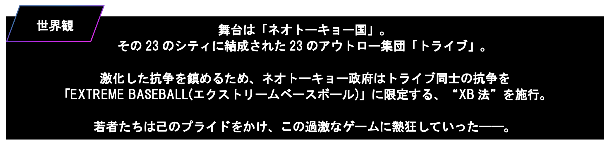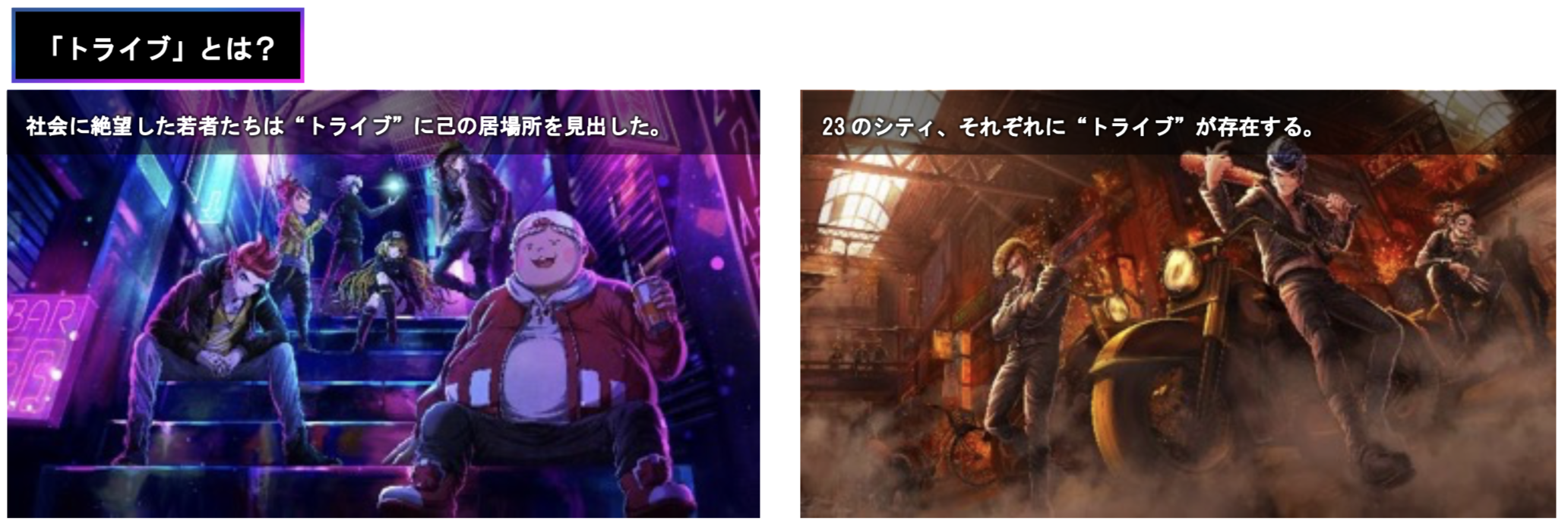 『ダンガンロンパ』シリーズの小高和剛率いるクリエイター集団「トゥーキョーゲームス」原作による、架空の東京を舞台に個性的なアウトロー達が抗争を繰り広げるバトルアクションストーリーをスマホゲームベンチャー「アカツキゲームス」が総合プロデュース。高品質な3Dグラフィックスを駆使したゲームの制作、テレビアニメ、WEBTOONなど、様々なメディアで『トライブナイン』の世界を展開していきます。