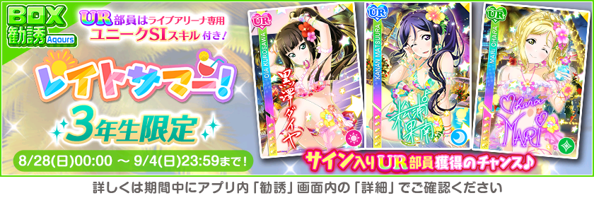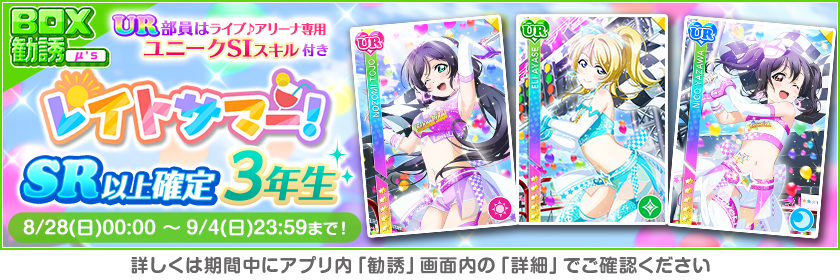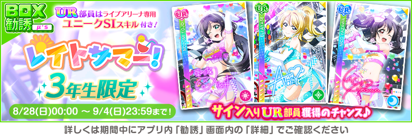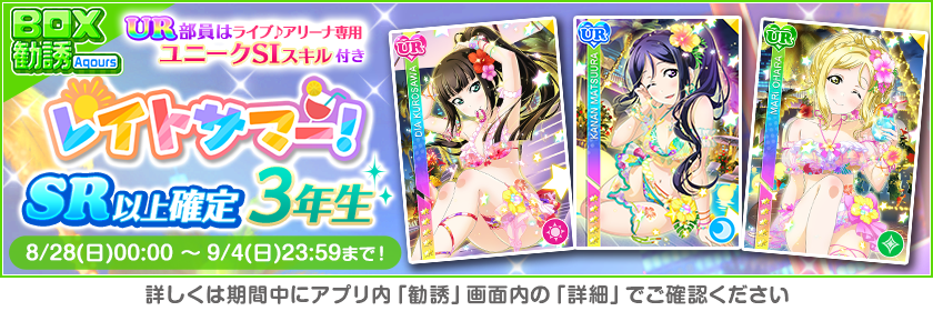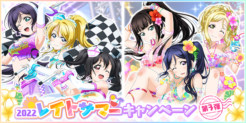 株式会社ブシロード(本社:東京都中野区、代表取締役社長:木谷高明)は、KLab株式会社(本社:東京都港区、代表取締役社長:森田英克)と共同開発いたしましたスマートフォン向けアプリ『ラブライブ!スクールアイドルフェスティバル』(以下、スクフェス) において2022レイトサマーキャンペーン第3弾の開催をお知らせいたします。