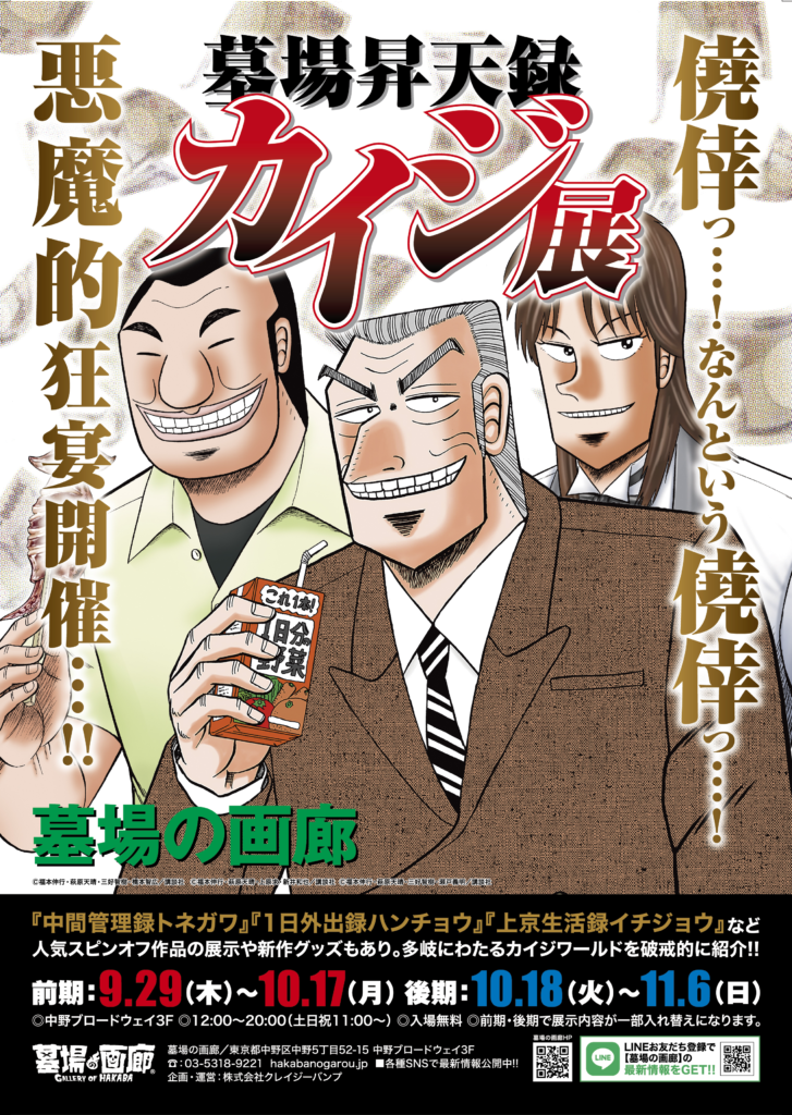 マンガ、アニメ、特撮などを始めとするサブカルチャーをテーマとした企画展を開催・運営している株式会社クレイジーバンプは9月29日(木)〜11月6日(日)の期間で【墓場昇天録カイジ展】(https://hakabanogarou.jp/archives/31244)を開催致します。