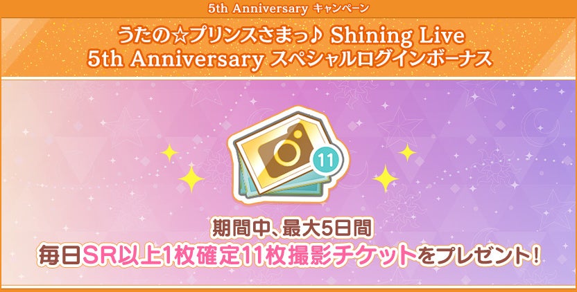 その他にも「5th Anniversary キャンペーン」として、「お気に入りの衣装アンケート」「5th Anniversaryミッションイベント 第1弾」期間限定ロケ「うたの☆プリンスさまっ♪ Shining Live 5th Anniversary」などを実施しております。