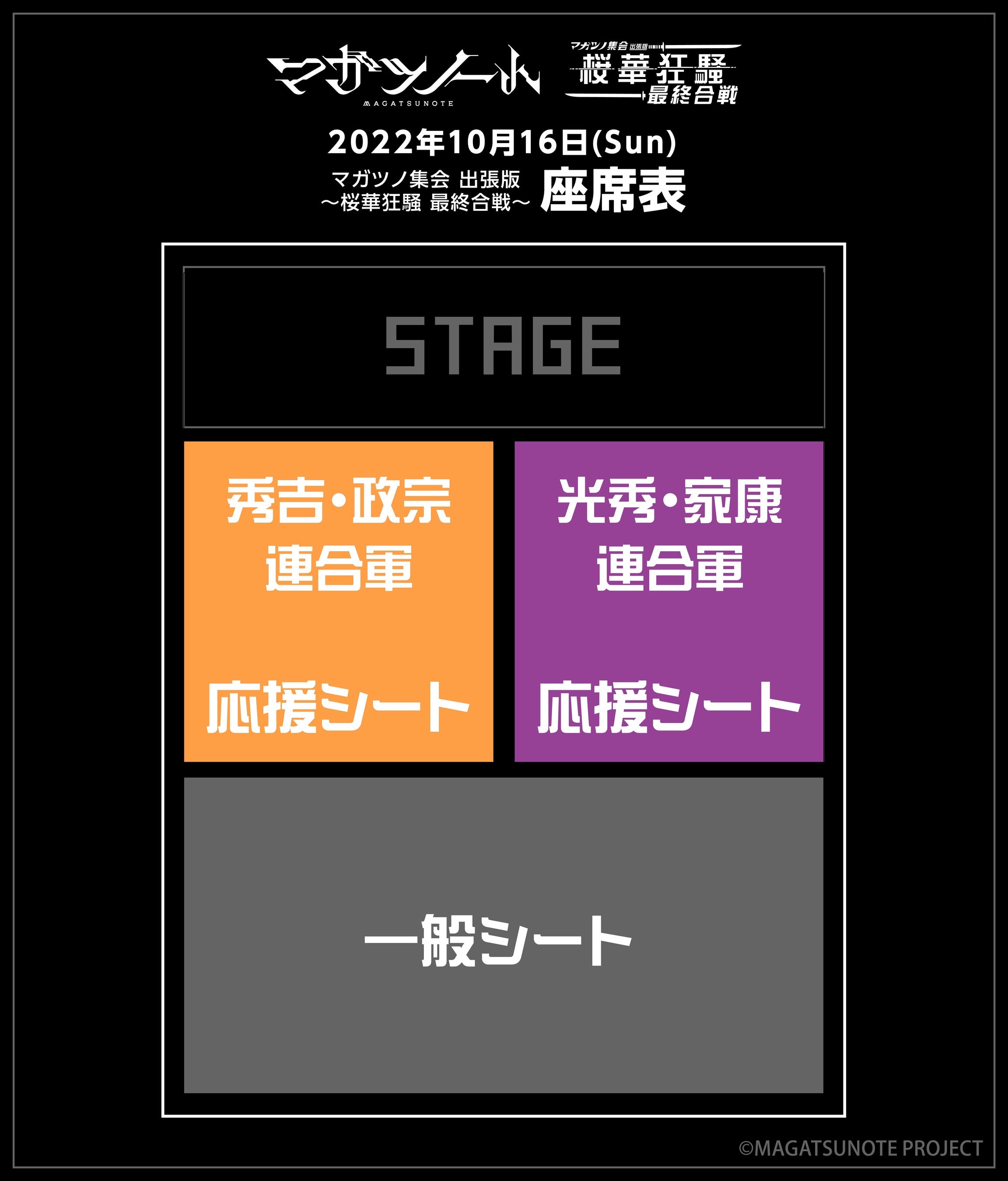 ※「秀吉・政宗連合軍 応援シート」「光秀・家康連合軍 応援シート」は「一般シート」よりも前方の座席となります。