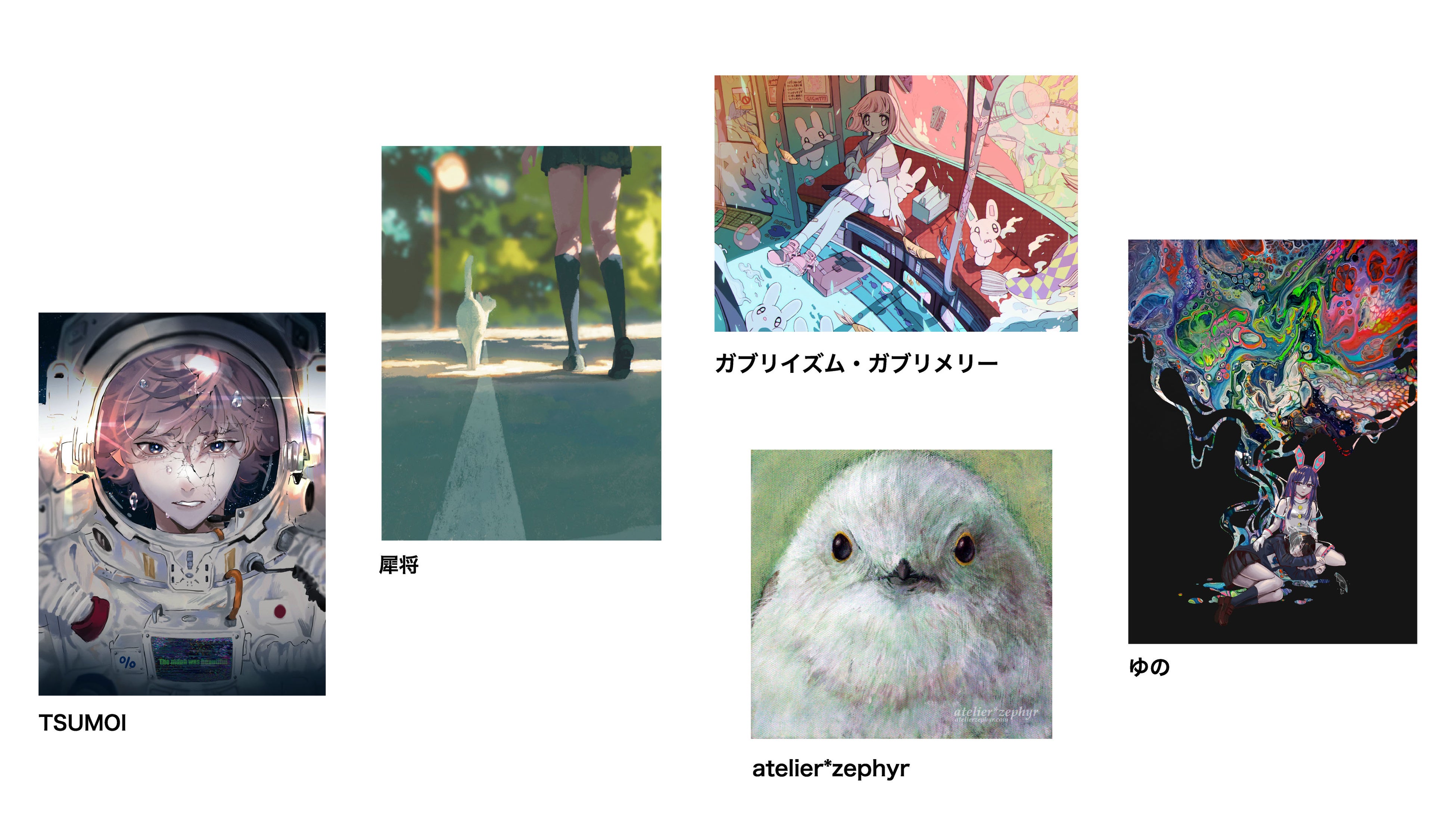 出現画廊は、アーティストやイラストレーター、アニメーターなど、新時代のクリエイターを発掘し、活躍の場を創出することができないか?そんな想いからスタートしたプロジェクトです。クリエイターと作品を世に広めるとともに、企業やファンとのマッチングを行い、ビジネスチャンス拡大に貢献いたします。