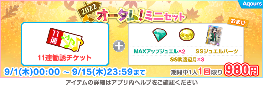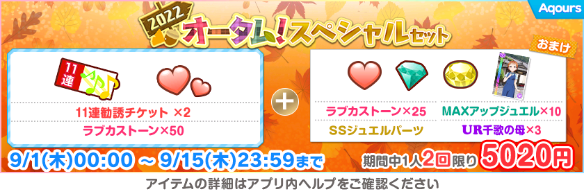 株式会社ブシロード(本社:東京都中野区、代表取締役社長:木谷高明)は、KLab株式会社(本社:東京都港区、代表取締役社長:森田英克)と共同開発いたしましたスマートフォン向けアプリ『ラブライブ!スクールアイドルフェスティバル』(以下、スクフェス) において2022スクフェスオータムキャンペーン第1弾の開催をお知らせいたします。