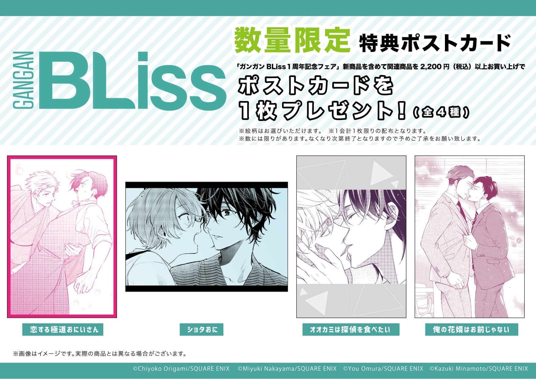 店頭で、『ガンガンBLiss 1周年フェア』新商品を含めて関連商品を2,200円(税込)以上お買い上げの方に、ポストカードを1枚プレゼントしています。