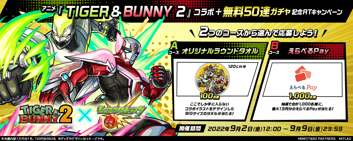 モンストキャンペーン公式Twitterアカウント(https://twitter.com/monst_campaign)が投稿する対象ツイートを期間内にリツイートすると、ここでしか手に入らない限定グッズ「『TIGER & BUNNY 2』×モンストオリジナルラウンドタオル」や、さまざまなスマホ決済サービスのポイントを自由にえらべる「えらべるPay」が抽選で当たります。
