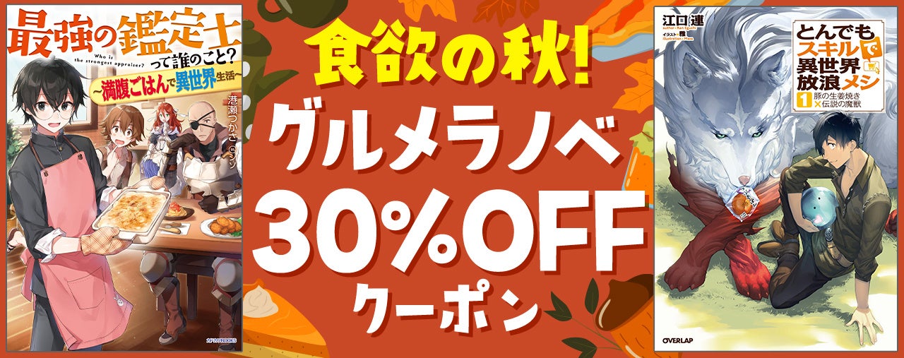 対象作品は約500冊! 食べ物がおいしいこの季節、「auブックパス」では“食欲の秋”に合わせて、ラノベ界で定番となりつつあるグルメ系の作品を大特集いたします。『最強の鑑定士って誰のこと? ~満腹ごはんで異世界生活~』や、『とんでもスキルで異世界放浪メシ』など、懐かしい作品から話題の作品まで書店員が厳選しました。また、対象作品に使える30%OFFクーポンも配布。ぜひこの機会に、お気に入りの本を探してみてはいかがでしょうか。