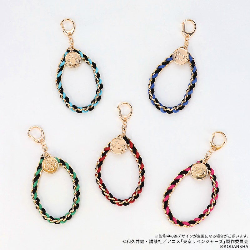 キャラクターのイメージカラーのスエード紐とチェーンを三つ編みにしたキーホルダー。