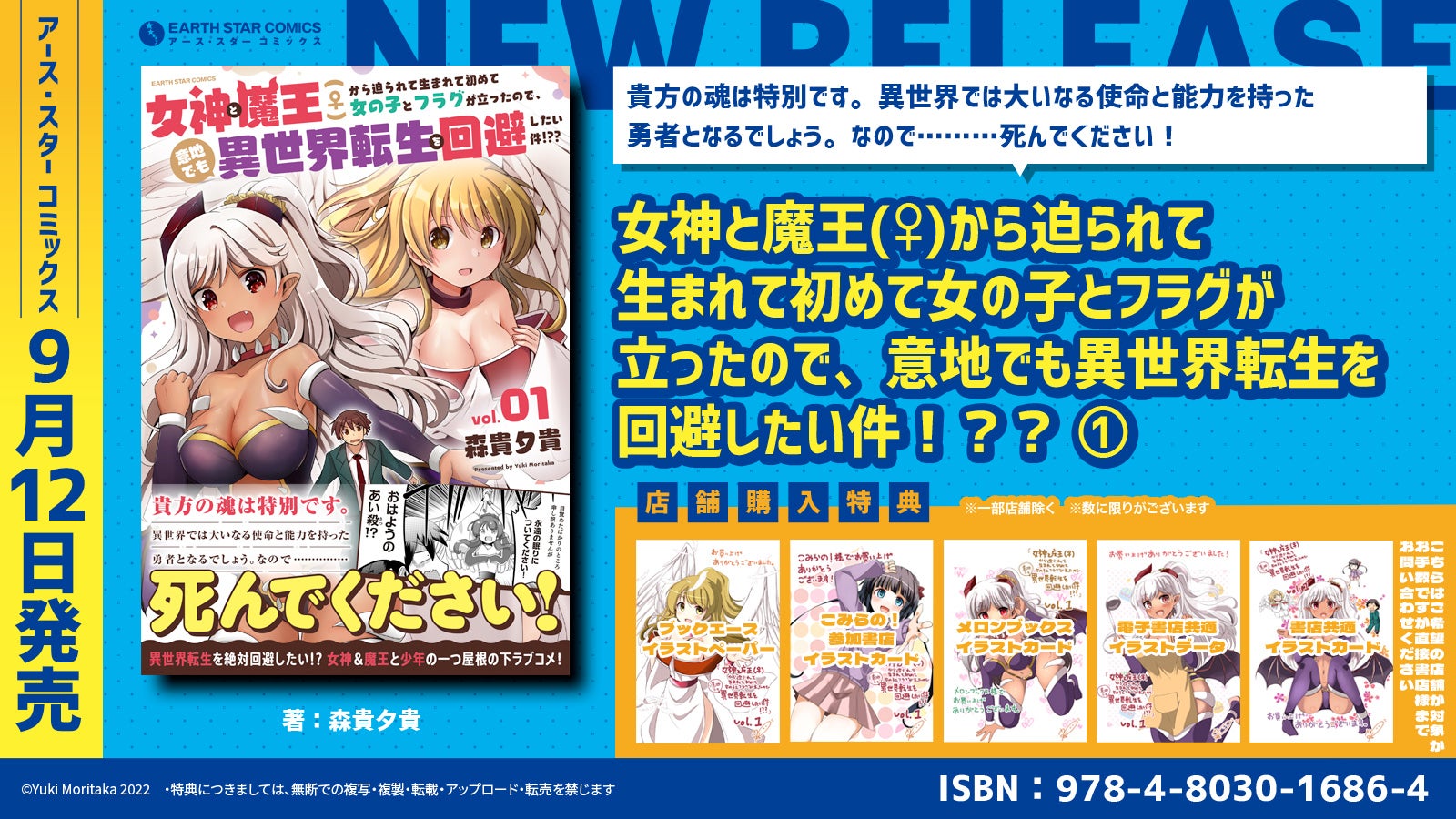 現在コミック アース・スターで連載中の人気作品『女神と魔王(♀)から迫られて生まれて初めて女の子とフラグが立ったので、意地でも異世界転生を回避したい件!??』コミックス第1巻を9月12日(月)に発売いたします。