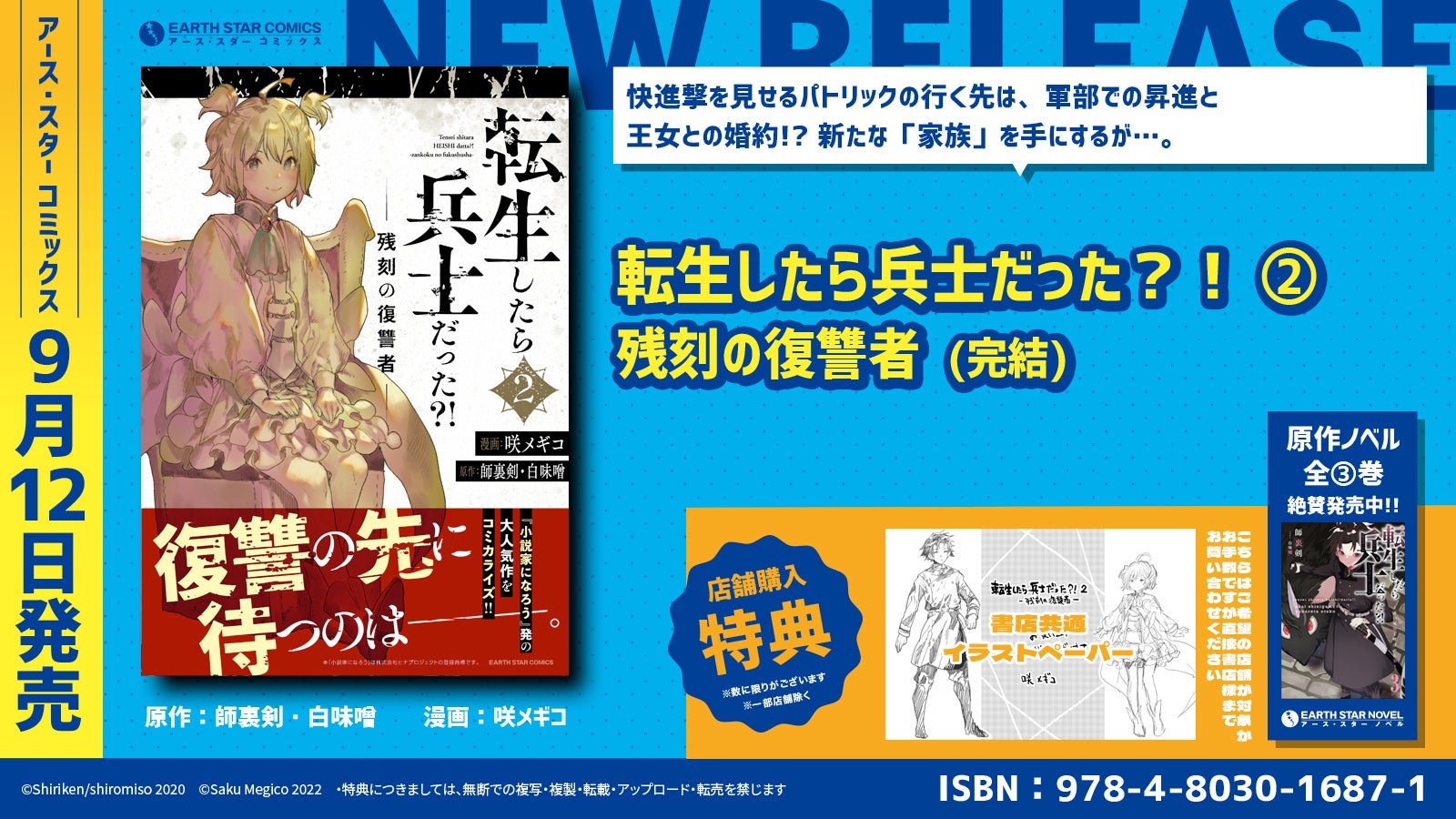 アース・スターノベルより刊行している人気ノベル作品が原作で、現在コミック アース・スターで連載中の人気作品『転生したら兵士だった?! 残刻の復讐者』コミックス第2巻を9月12日(月)に発売いたします。