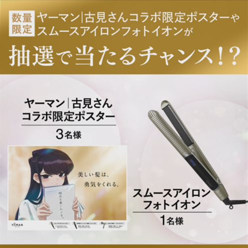 キャンペーン第一弾では、該当のキャンペーン投稿をリツイートしていただいた方の中から抽選で3名様にオダトモヒト先生監修の「ヤーマン|古見さんコラボ限定ポスター」、1名様にヘアケアストレートアイロン『スムースアイロンフォトイオン』が当たります。キャンペーン実施期間中に、5330リツイートを超えると、ヤーマン公式Twitterにて第二弾、第三弾とさらにキャンペーンが実施されます。