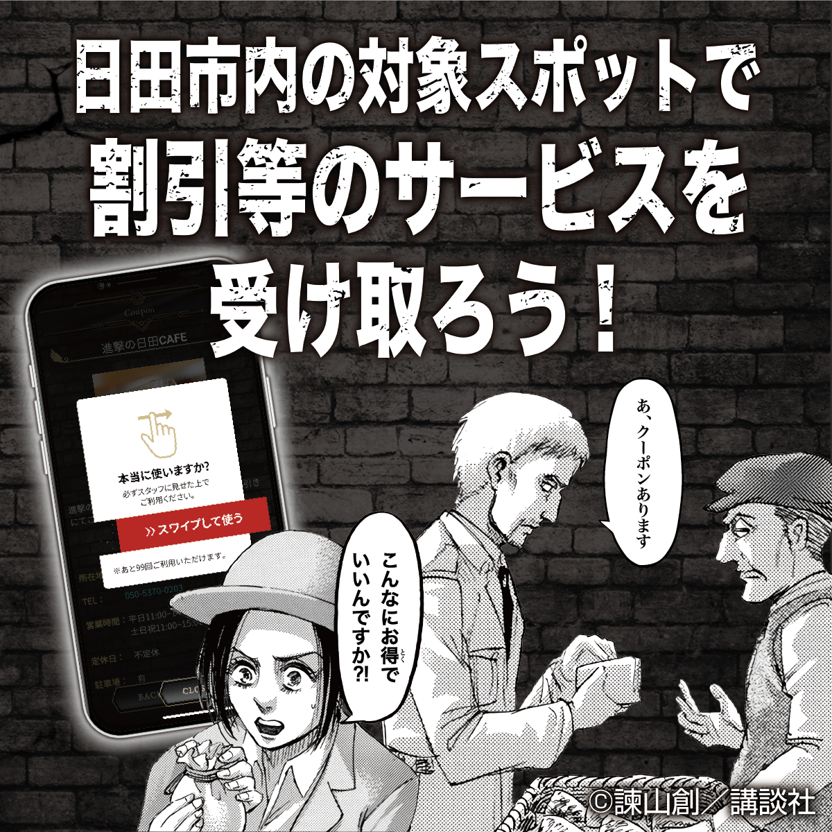 進撃の日田エリアの様々な店舗・施設で利用できるクーポンを『進撃の巨人 in HITAアプリ』から自動配信(無料)いたします。割引や進撃の日田コラボ商品プレゼントなど、クーポン特典は様々!使い方はカンタン!所定のお店でクーポン画面を提示するだけで、サービスが受けられます!クーポン内容は不定期に更新されます。お見逃しなく!