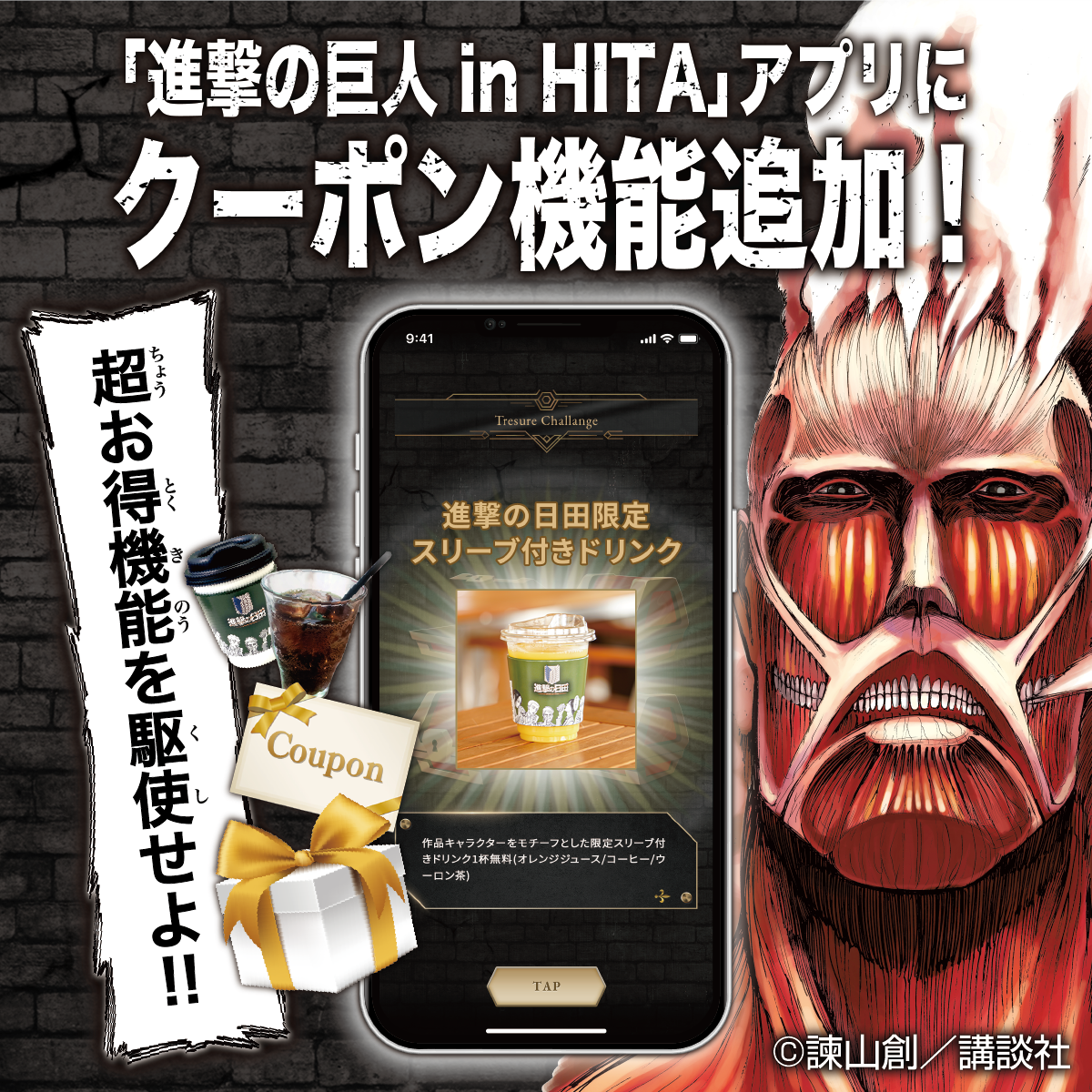 『進撃の巨人』原作者、諫山創先生の故郷、大分県日田市で大好評展開中の地方創生プロジェクト「進撃の日田」のアプリに、日田市周遊をお得に楽しめる「スタンプラリー」と「クーポン」機能を追加しました。『進撃の巨人 in HITAアプリ』のダウンロードで、どなたでも無料でご参加いただけます。