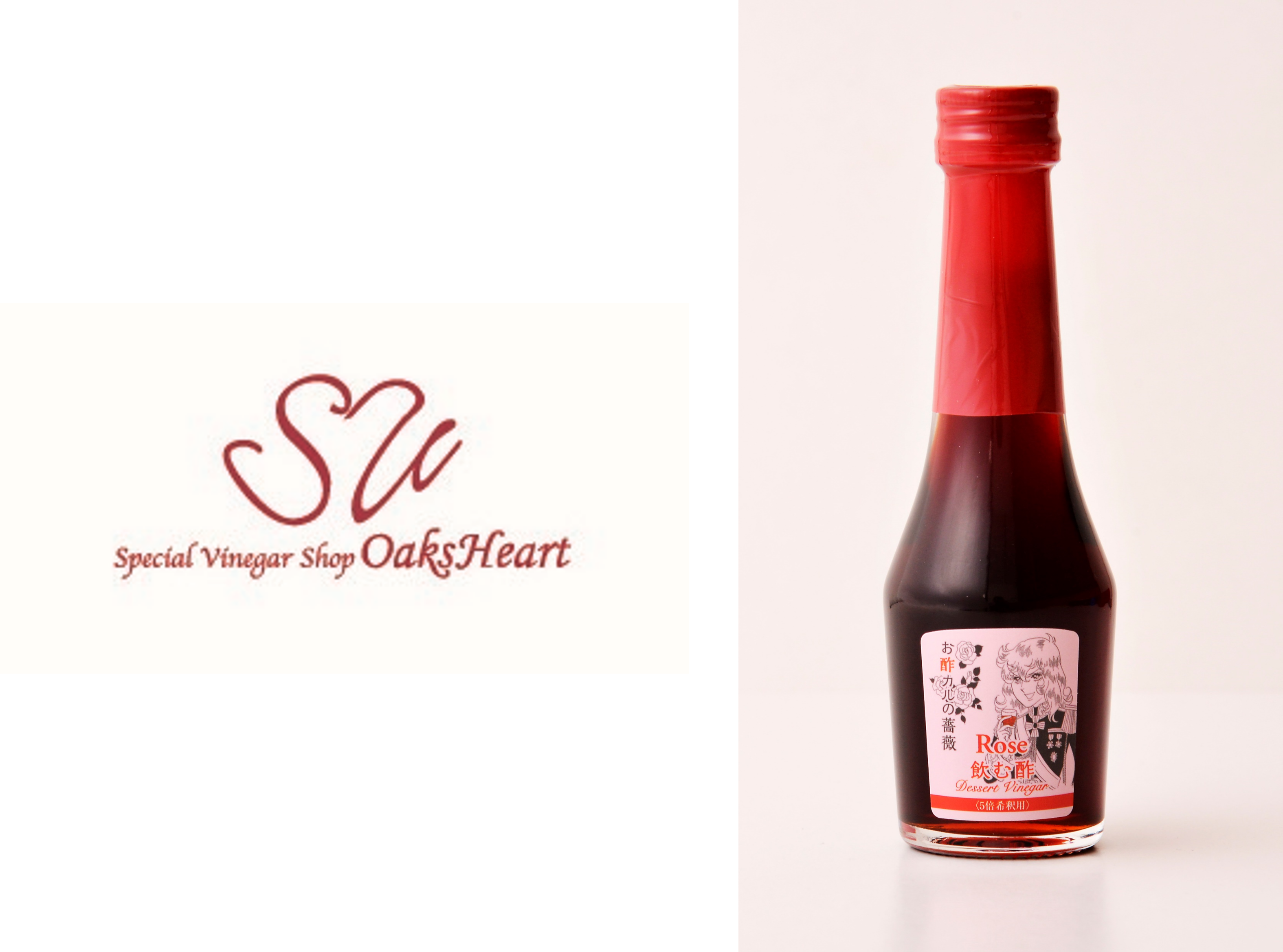 オークスハートは“酢のおいしさ新発見”をコンセプトに、日本で初めての酢の専門店として誕生したブランドです。酢をデザート感覚で楽しめるように作られた“デザートビネガー®”を専門に販売しています。“薔薇の酢”はローズヒップ果汁から造られた果実酢を使用し、薔薇の華やかな香りをお楽しみいただける商品です。ベルばらファンのための限定ボトルです。水や炭酸水で5倍に薄めてお召し上がりください。アイスクリームにかけても美味しいです。