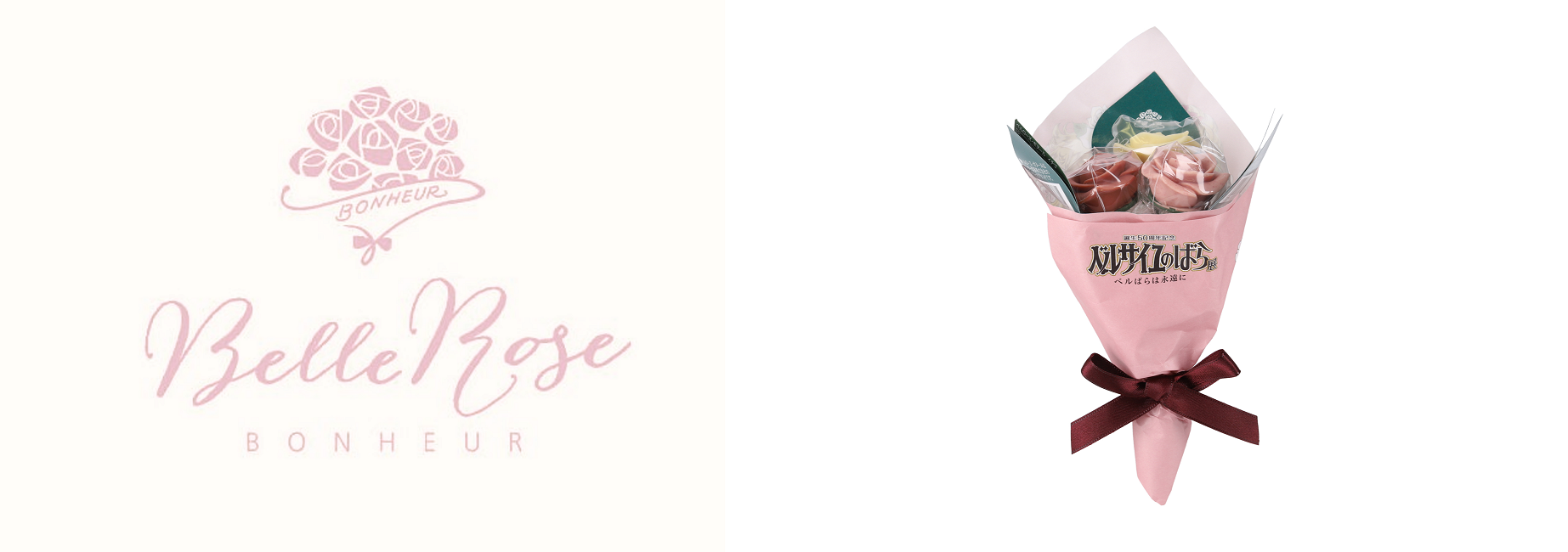 「ベルローズ・ボヌール」とは、「しあわせの綺麗なバラ」という意味。日々の暮らしの中に笑顔としあわせをお届けしたいという想いから誕生したブランドです。本物のバラと見間違うようなバラのショコラは、自社工場にて1つ1つ心を込めてお作りしております。色、香り、美しさ、華やかさ。気高く咲き誇る薔薇のショコラ。ベルばらファンのために選りすぐりのフレーバーでブーケを作りました。