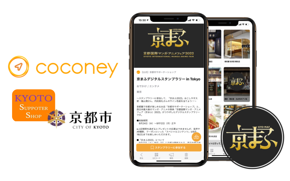 株式会社ビーブリッジ(本社:東京都千代田区、代表取締役:野崎 良博)提供のARを活用したおでかけ情報サービス『coconey(ココニー)』と連携する京都市総合企画局東京事務所(所在:東京都千代田区)運営の京都市サポーターショップを巡る新スポットリストとスタンプラリーイベントを、2022年8月24日より開始。本イベントは、2022年9月17日より京都市内で開催される「京まふ2022」の開催に合わせて行われ、京まふおこしやす大使の内田真礼さん・福山潤さんのオリジナル音声の再生、また音声内のキーワードを集めて景品を獲得できる内容になっています。