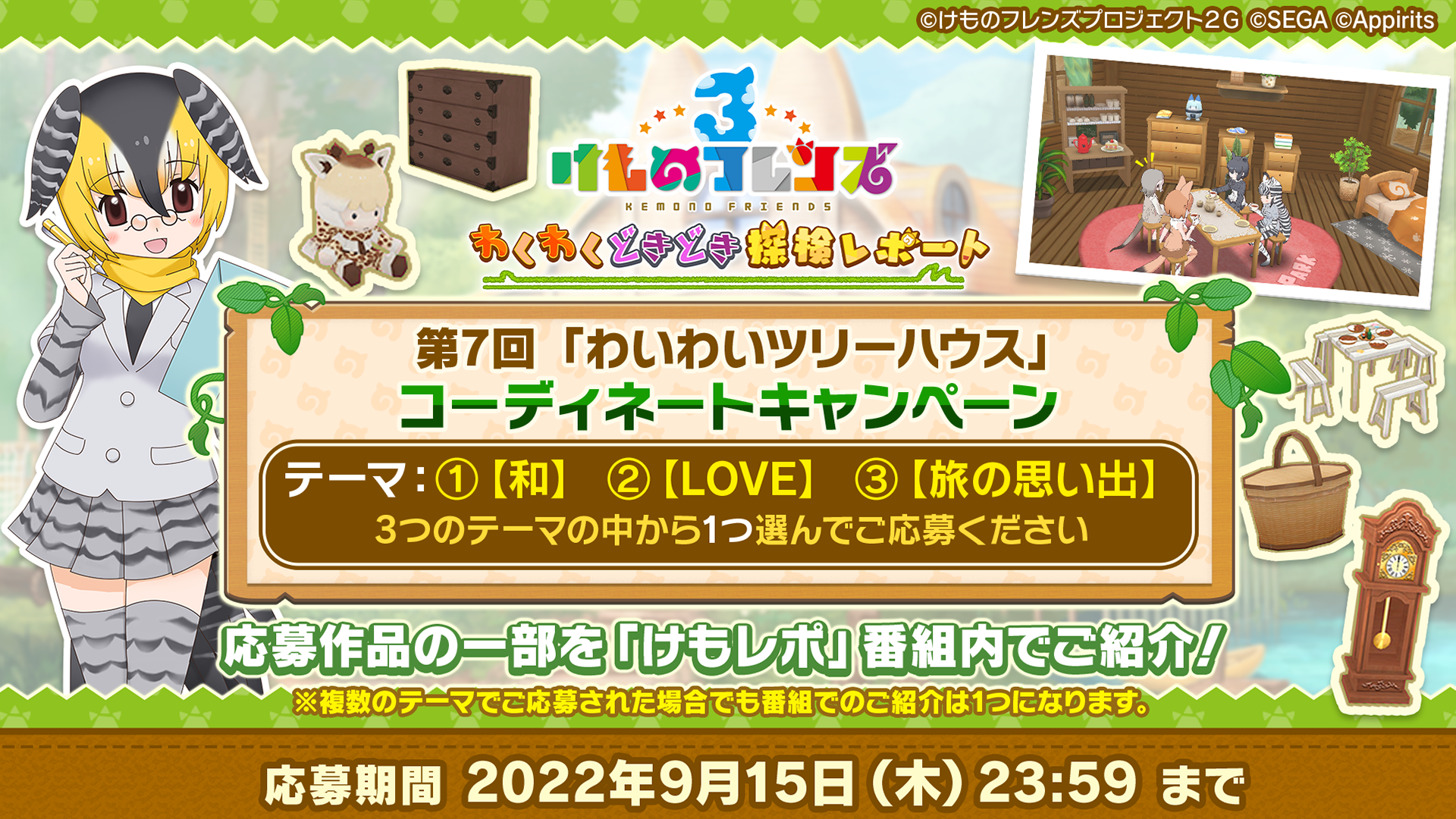 好評の番組コーナー企画として、生放送配信に先駆け『けものフレンズ3』公式Twitter(@kemono_friends3)で、「第7回 わいわいツリーハウスコーディネートキャンペーン」を実施いたします。
