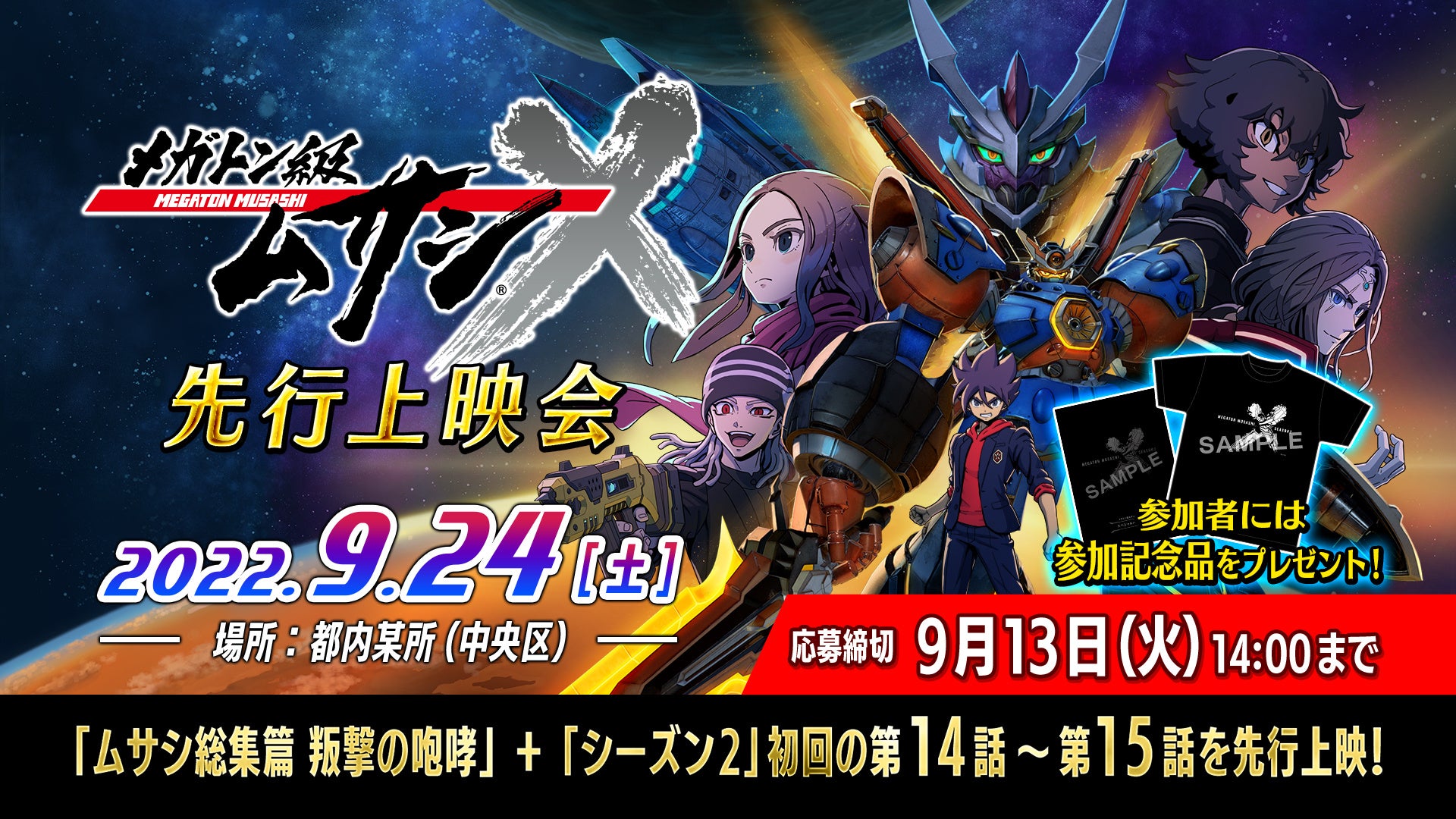 株式会社レベルファイブ(本社:福岡市中央区、代表取締役社長/CEO:日野晃博)は、クロスメディアプロジェクト最新作となるTVアニメ「メガトン級ムサシ シーズン2」の先行上映会を、2022年9月24日(土)に都内にて開催することを決定、本日より応募を開始することをお知らせいたします。