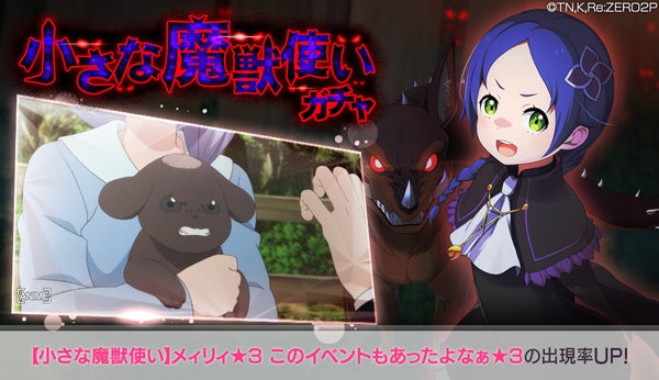 内容:本日よりキャラクター「【小さな魔獣使い】メィリィ★3」記憶結晶「このイベントもあったよなぁ★3」の出現率がUP する「【小さな魔獣使い】ガチャ」を開催します。