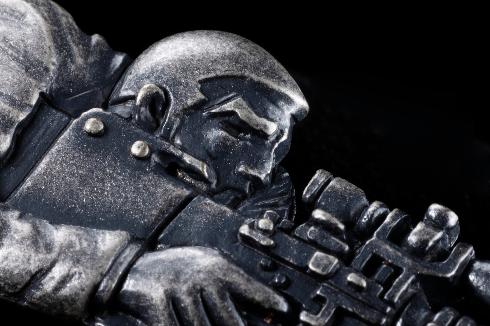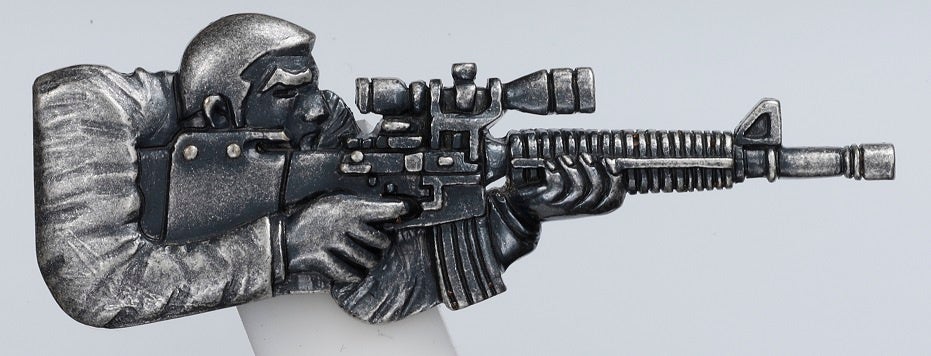 愛銃アーマライトM16を構えるデューク・東郷の特徴的な太い眉毛に鋭い目つき。狙撃の瞬間を真鍮で立体的に再現しており、原作ファンも納得の仕上がりです。
