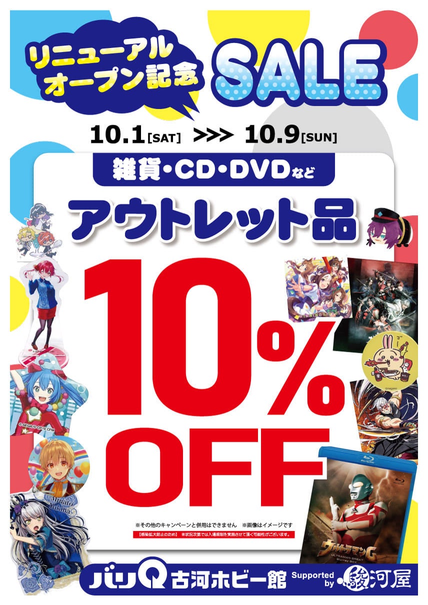 アウトレットのアイテムが10%OFF!全国の駿河屋で大人気のアウトレット売り場。1日中お宝探しを楽しめると大好評です♪