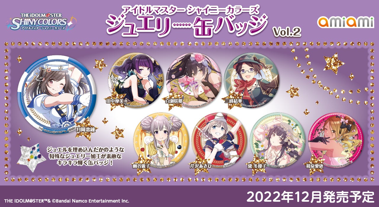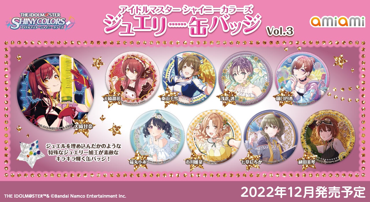 フィギュア&ホビー通販大手の「あみあみ」を運営する、大網株式会社(本社・東京都文京区)は、『アイドルマスター シャイニーカラーズ ジュエリー缶バッジ』のVol.1~3を、2022年12月予定で同時に発売いたします。