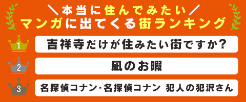 「吉祥寺だけが住みたい街ですか?」(講談社)に登場する「東京・吉祥寺」は1,495票を獲得し、第2位に500票以上の差をつけ、堂々の1位に輝きました。第2位は、976票で「凪のお暇」(秋田書店)に登場する「東京・立川市」がランクインし、第3位は僅差で915票を獲得し「名探偵コナン・名探偵コナン 犯人の犯沢さん」(小学館)に登場する「米花町」がランクインしました。
