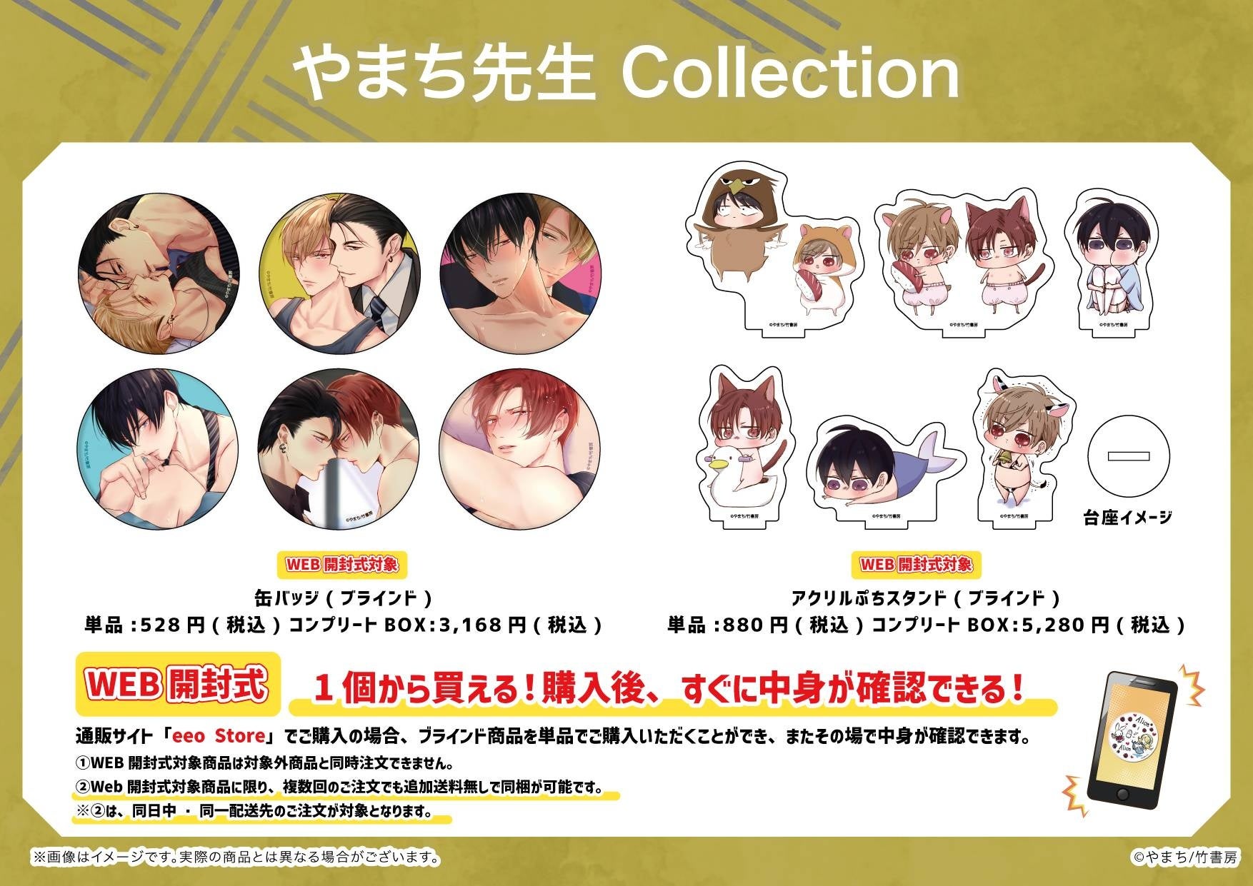 通販サイト「eeo Store」でご購入の場合、ブラインド商品(缶バッジ・アクリルぷちスタンド)を単品でご購入いただくことが可能です。さらにWEB開封式をご利用いただくと、その場でブラインド商品の中身が確認できます♪