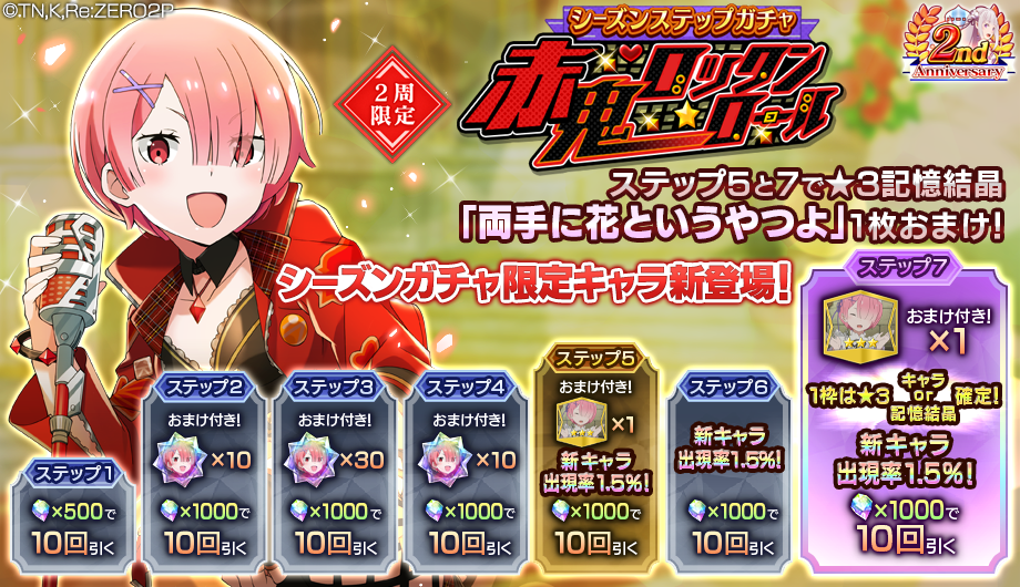 ステップ1では「魔法石500個」で10回ガチャを引くことができ、ステップ2・3・4では「【赤鬼ロックンロール】ラムのかけら」、ステップ5・6・7ではピックアップキャラの出現率が1.5%、ステップ5では記憶結晶「両手に花というやつよ!★3」のおまけ付き、ステップ7では10連中★3キャラもしくは★3記憶結晶が1枠確定&記憶結晶「両手に花というやつよ★3」のおまけが付きます。