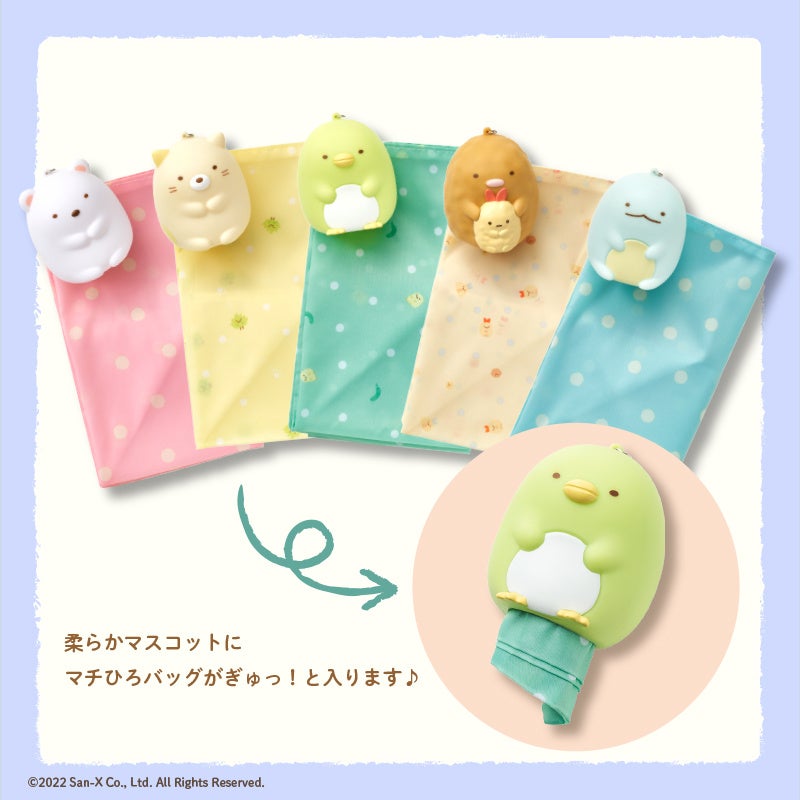 マチひろバッグはくるっと丸めてマスコットに入れて収納! 色や柄もそれぞれのすみっコに合わせた柄になっています♪