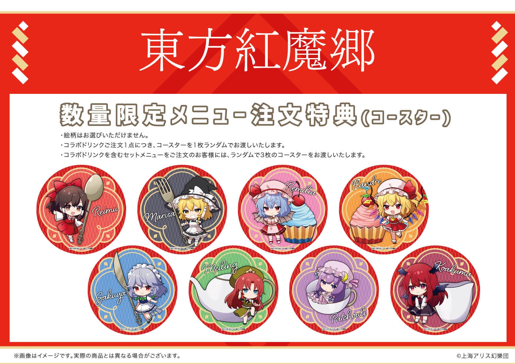 ドリンクは「巫女さんと魔法使いのクランベリーソーダ」、「吸血鬼姉妹のスカーレットドリンク」、「紅魔館従者のブルーメロンソーダ」、「日陰少女とお付き悪魔の巨峰ホワイト」の4種類。