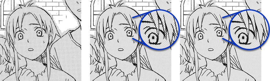 左:従来処理(モアレあり)、中:eComicScreen+、右:eComicScreen+ ver2